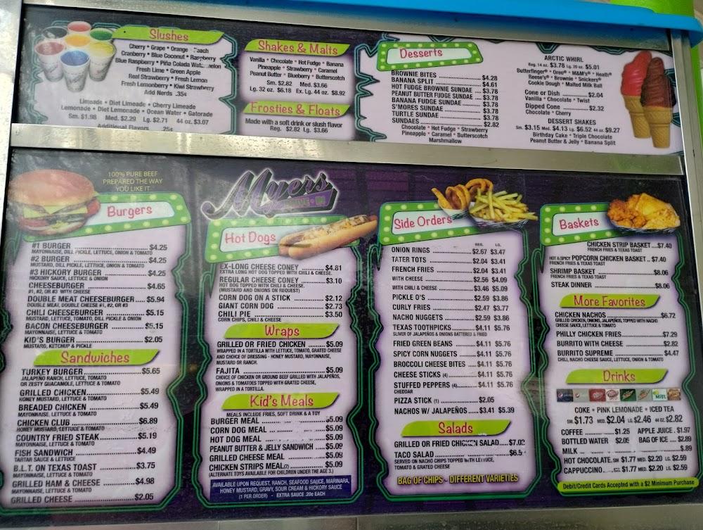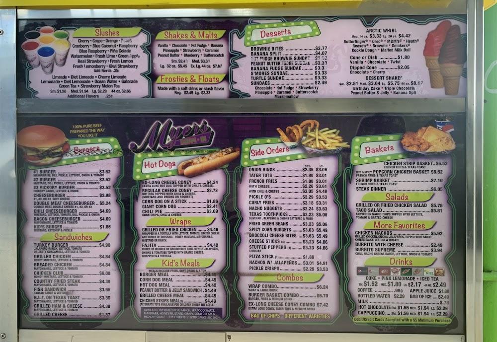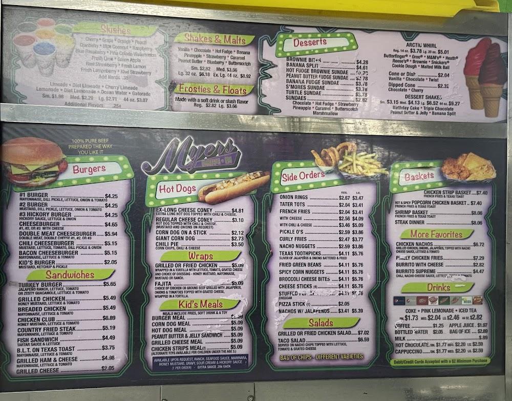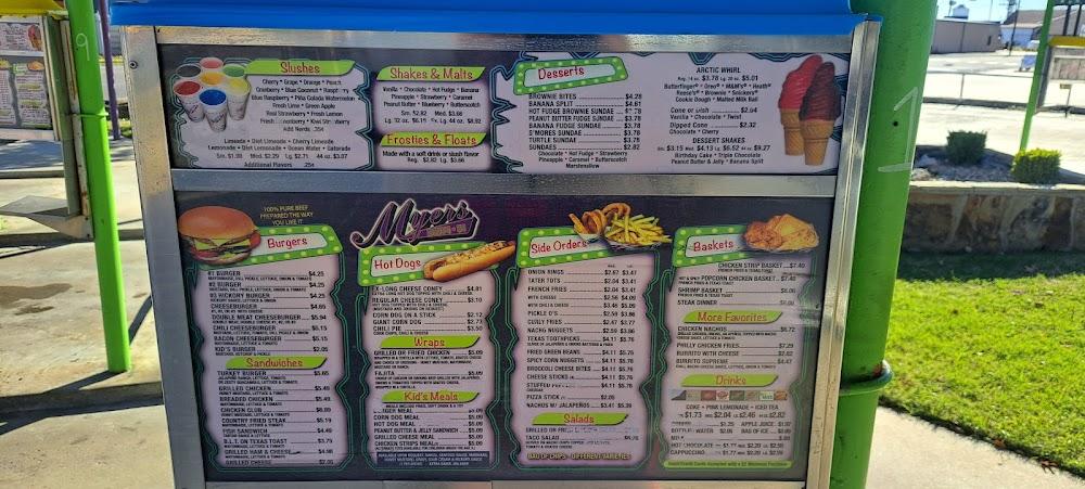 Desserts feature an array of sweet treats like banana splits and brownies, rounding out the meal nicely. The drink selection, from shakes to slushes, adds a refreshing touch. Each dish is prepared with care, ensuring that flavors shine. Perfect for a quick meal or family gathering, Myers Drive-In truly serves comfort food that warms the heart.